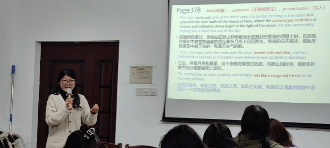 在领读研讨沙龙过程中,同学们结合各自的阅读体验,分享了所选作品的作者信息、社会背景、主题思想与意义等,讨论了诸如作品宏大叙事与个体成长、社会观察与人文关怀、家庭与爱情等发人深省的话题,还不失时机地拓展思考我们当下的社会生活现实。在研读经典作品的同时,同学们还充分利用自己在专业课程中学习到的结构分析、英汉翻译、修辞手段、词汇构造等技巧,灵活运用于作品研读分享的各个环节,巧妙地融经典赏析于日常语言学习过程之中。