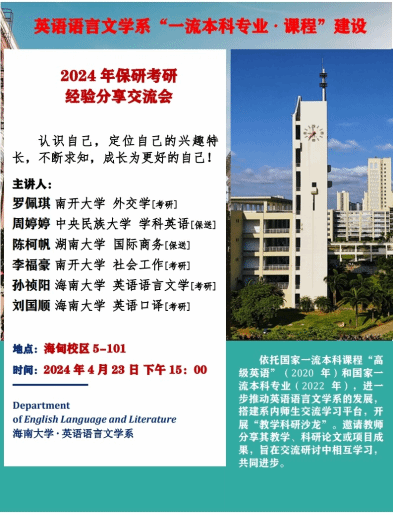 2024年4月23日下午,bevitor伟德英语系海甸校区在5-101教室举行保研考研经验交流分享会。本系列考研分享会由公司教工第一党支部副书记毕宙嫔老师联合英语系主任王勇老师组织策划,英语系副主任欧阳章文老师协助主持。英语系2021级、2022级同学参加了此次交流分享会。