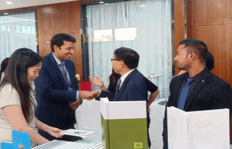 图7 工作人员与巴基斯坦农业与环境记者协会主席Shahzad Hussain Naqvi合影留念