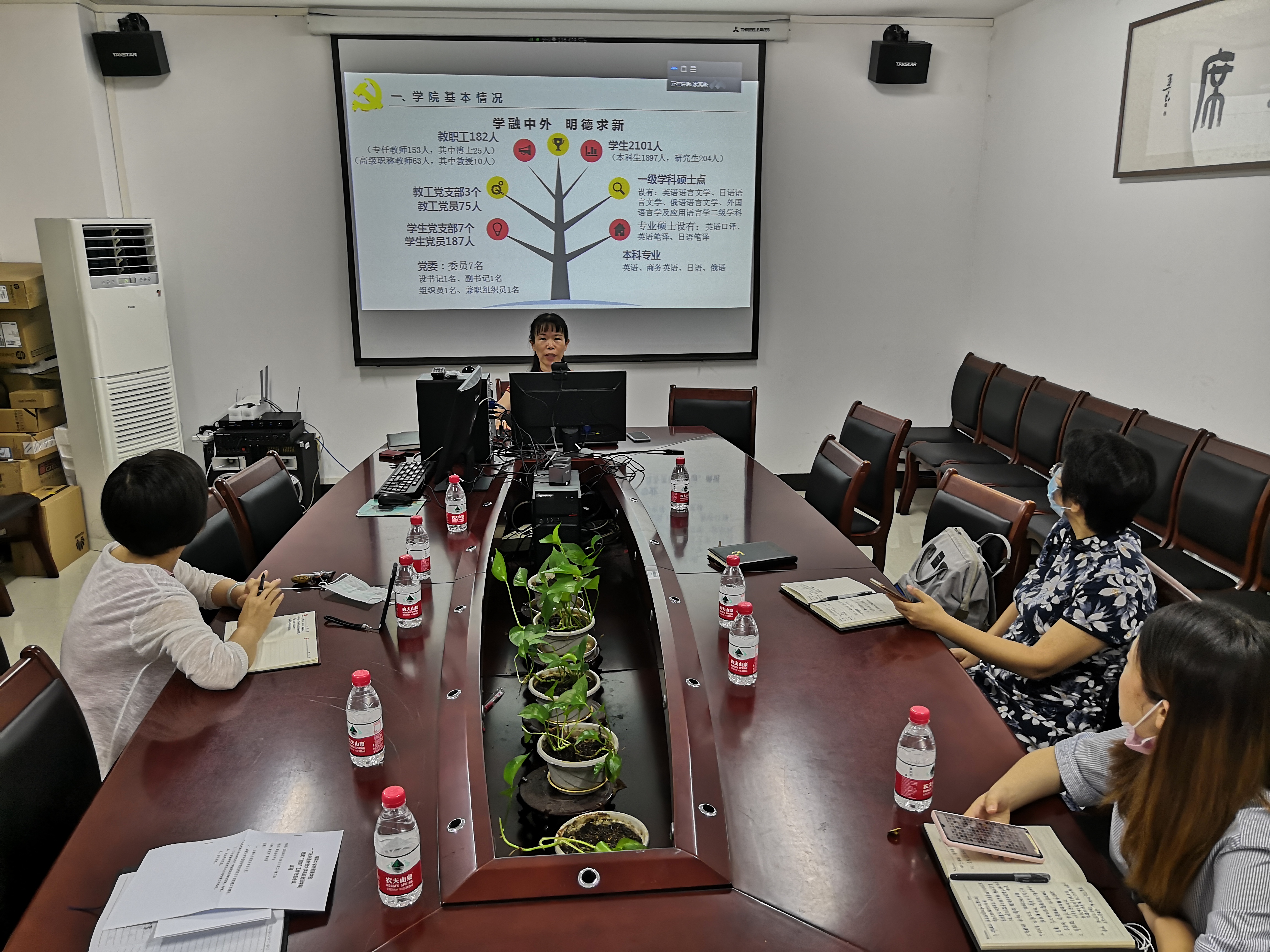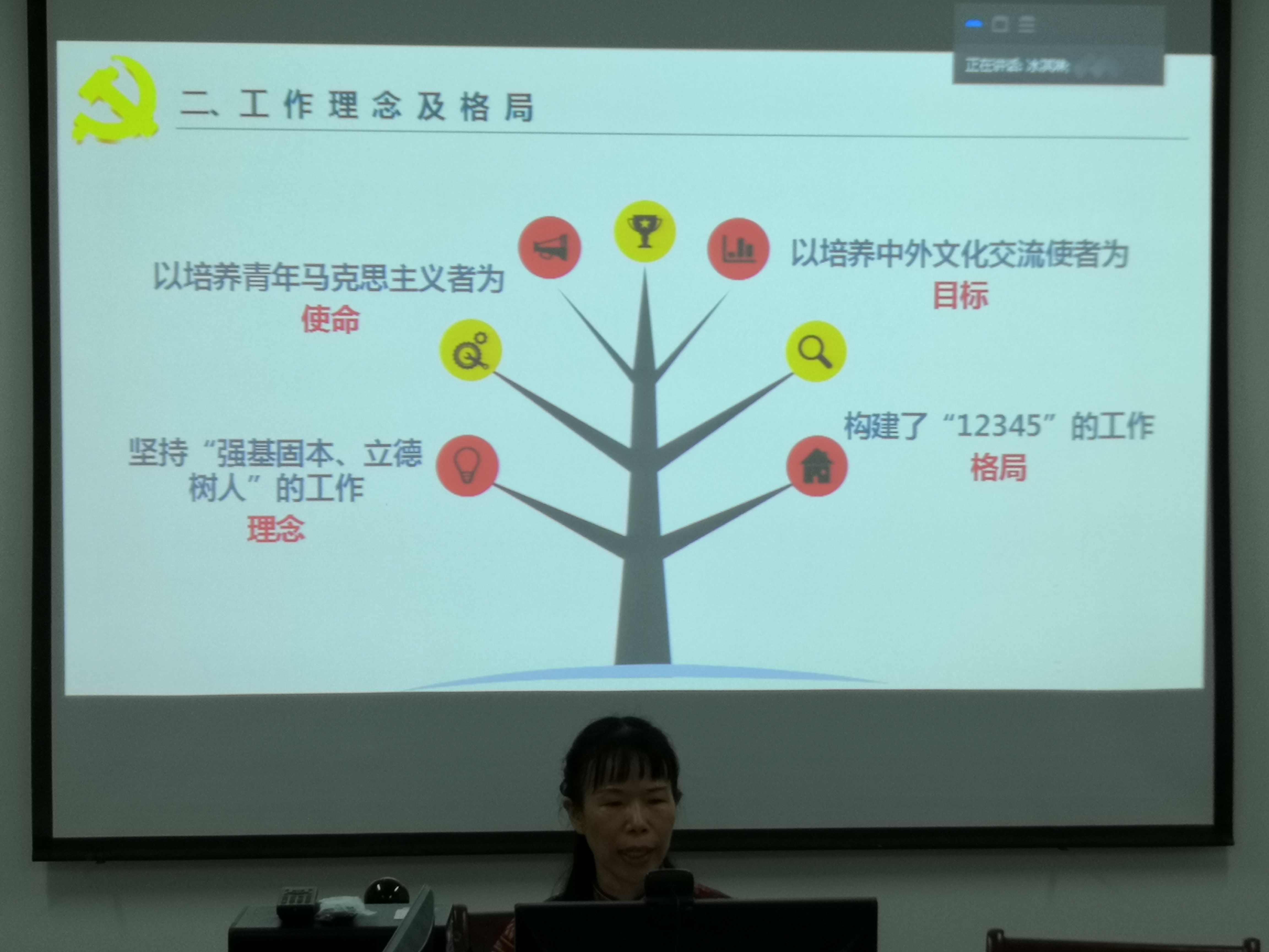 黄丽芹对广东外语外贸大学高级翻译公司的邀请表示感谢,她介绍了BEVITOR伟德公司党建工作的理念、思路和主要成绩,着重介绍了“12345”格局的主要做法,即一心(育人初心)、二化(标准化和信息化)、三力(凝聚力、组织力和创造力)、四促(党建促发展、文化促自信、制度促规范、品牌促工作)、五旗(信念之旗、学习之旗、教研之旗、文明之旗、奉献之旗);接着,她围绕着五个到位分享了成功申报第二批“全国党建工作标杆院系”培育创建单位的经验和体会;最后,她从实施铸魂计划、培根计划、守正计划、固本计划和创新计划五个方面,介绍了下一阶段的工作安排。