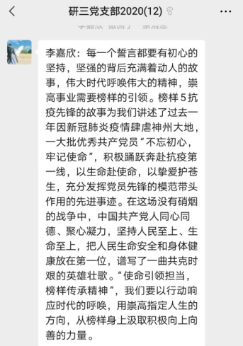 2020年对所有人来说都是与众不同的一年。在抗疫中,涌现了一大批“榜样”,正是这些“榜样”让我们更加清楚的看到了我们是什么样的民族,共产党有多么强大的领导力和凝聚力。这些“榜样”在平凡的岗位上,做着伟大的事业,他们身体力行地告诉我们党员具有的使命和应当承担的责任,他们把“为人民服务”融进了自己的血液之中。他们在抗击疫情中展现的“抗疫精神”,也将嵌入伟大的中华民族精神中去,代代传承,教导着后人向这样的“榜样”靠齐。