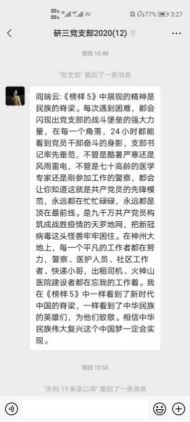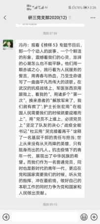 看完《榜样5》后,支部党员内心澎湃,看到他们践行着自己的入党誓词,不忘初心、牢记使命,积极响应新时代的号召,自己也受到榜样力量的鼓舞,纷纷发表了感想。
