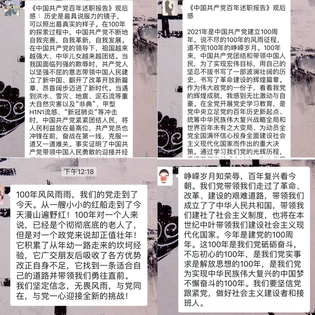 通过本次主题党日活动--观看《中国共产党百年述职报告》,不仅让我们更加清楚地了解了中国共产党的百年历史,而且也让我们深刻体会到中国共产党带领中国人民走到今天的不易。同志们纷纷表示,为中国共产党感到自豪,为作为一名共产党员感到自豪;今后将会更加认真学习,紧跟党的脚步,为祖国建设添砖加瓦。