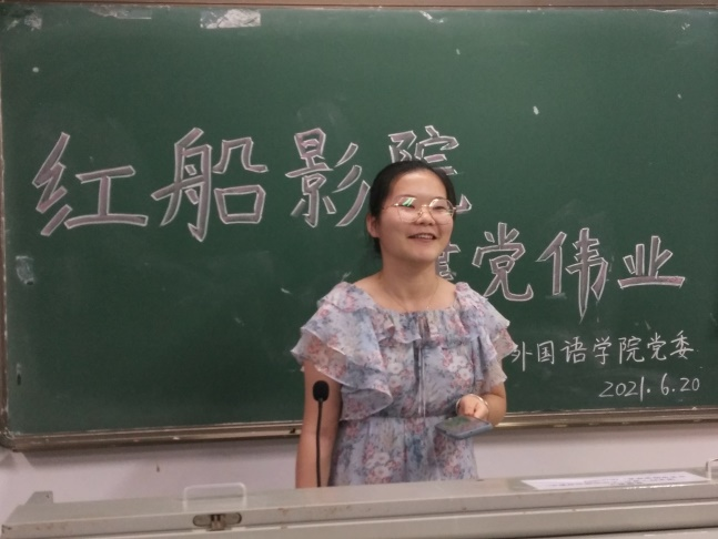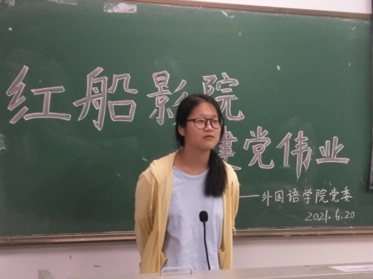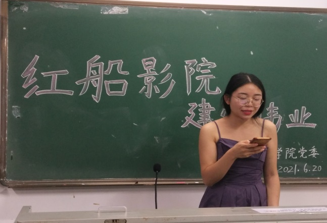 活动由邓驰菲同志主持。观影开始之前,主持人简要说明了该片是为庆祝中国共产党建党九十周年而制作的献礼影片。讲述了从1911年辛亥革命爆发开始至1921年中国共产党第一次全国代表大会召开;讲述了这10年间民初动乱、五四运动及中共建党等一系列重大历史事件。中国共产党的建党历程充满艰辛,革命先烈们不畏强敌,敢于牺牲奉献。在100年后的今天,我们仍要学习革命先烈们的不怕苦、不怕难的精神,励精图治,好好学习,在这个和平年代为国家发展也献出自己的一份力量。