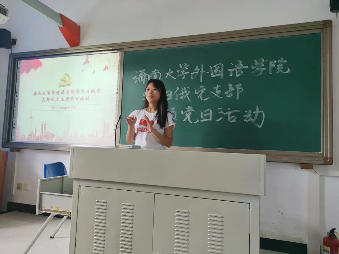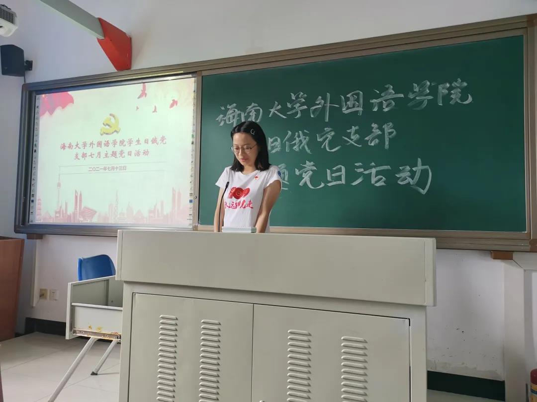 2021年7月7日八点三十分,员工日俄党支部七月份主题党日活动在教学楼5-116室召开,会议就支部同志观看学习习总书记在庆祝中国共产党成立一百周年大会上发表的重要讲话、并围绕所产生的感想进行分享讨论。会议由张淑侨同志主持,全体党员参加。