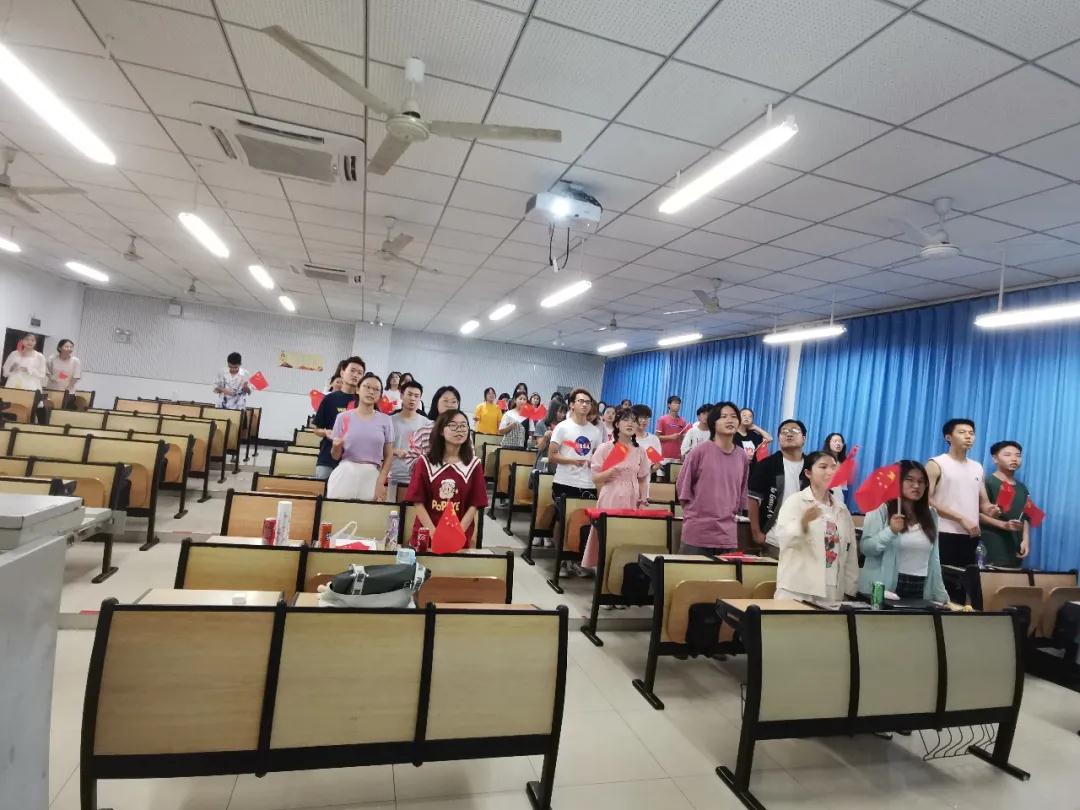 在同学们发言结束后,主持人组织在场同学挥动手中国旗,一起合唱《没有共产党就没有新中国》。
