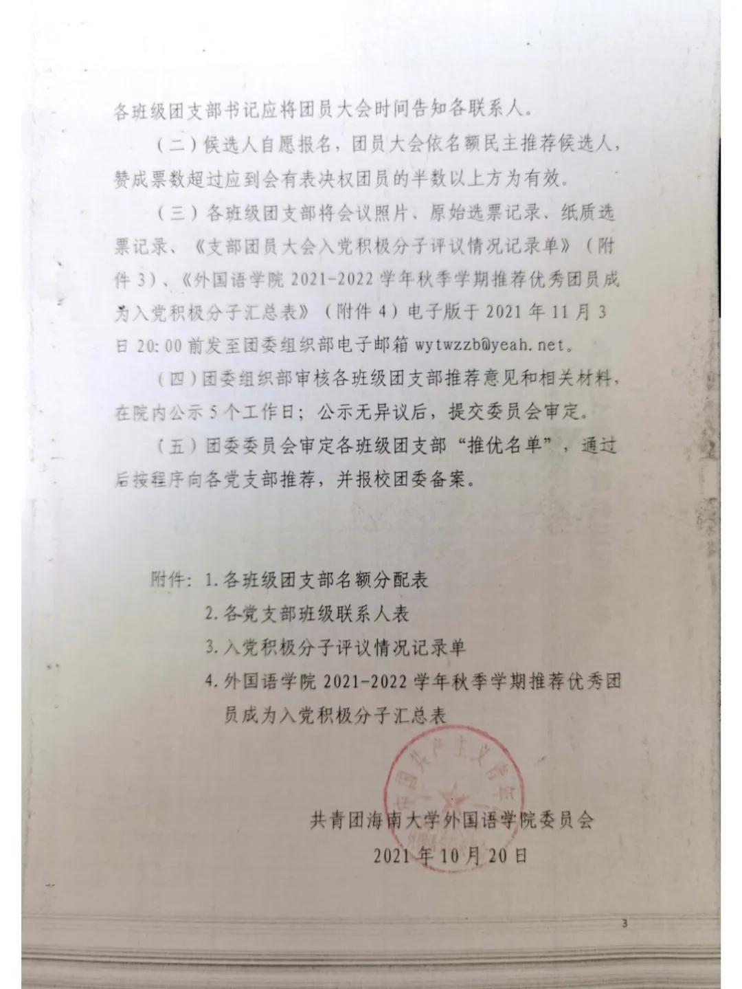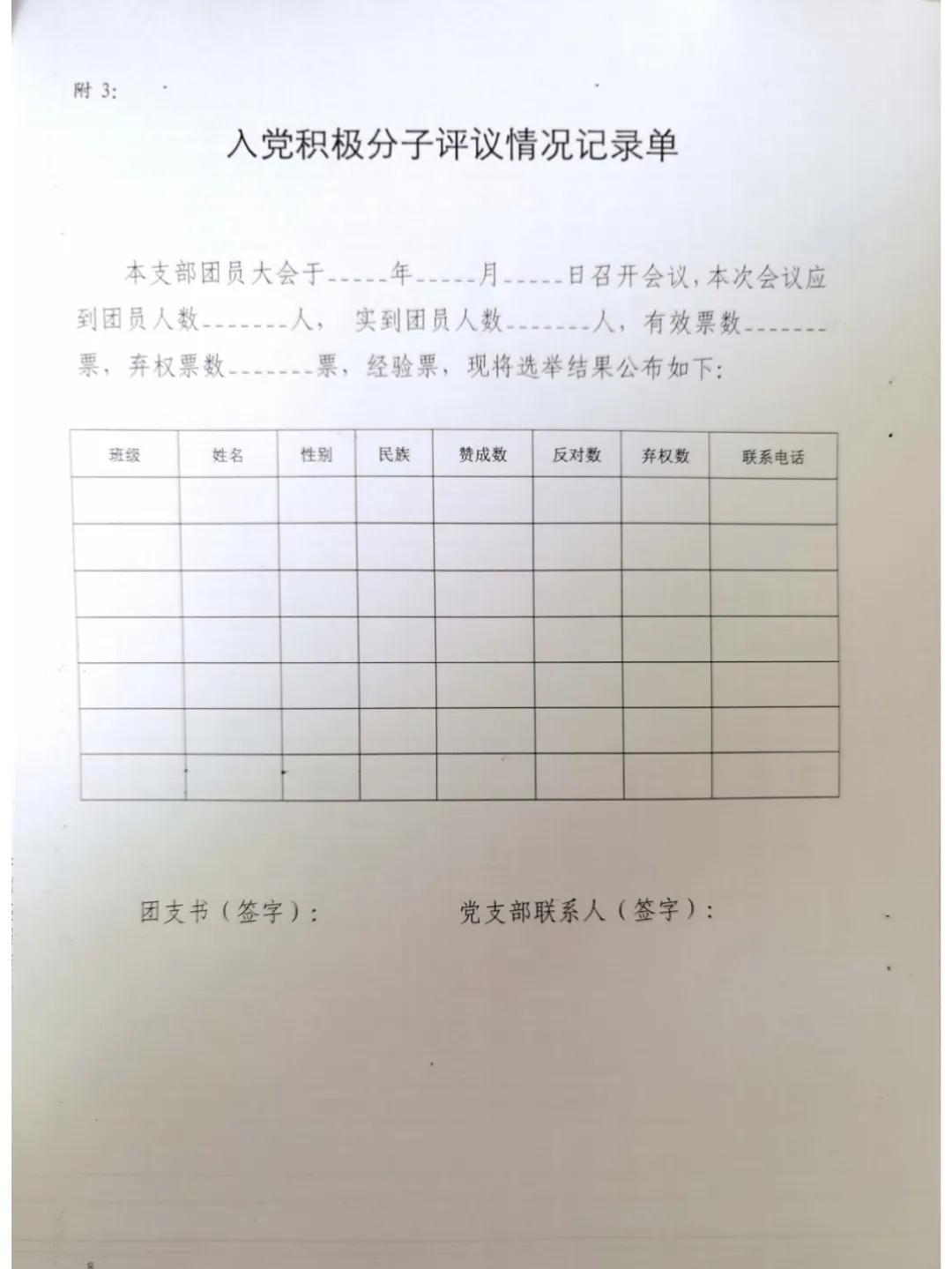 (三)各班级团支部将会议照片、原始选票记录、纸质选票记录、《支部团员大会入党积极分子评议情况记录单》(附件3)、《2021-2022学年秋季学期推荐优秀团员成为入党积极分子汇总表》(附件4)电子版于2021年11月3日20:00前发至团委组织部电子邮箱wytwzzb@yeah.net。