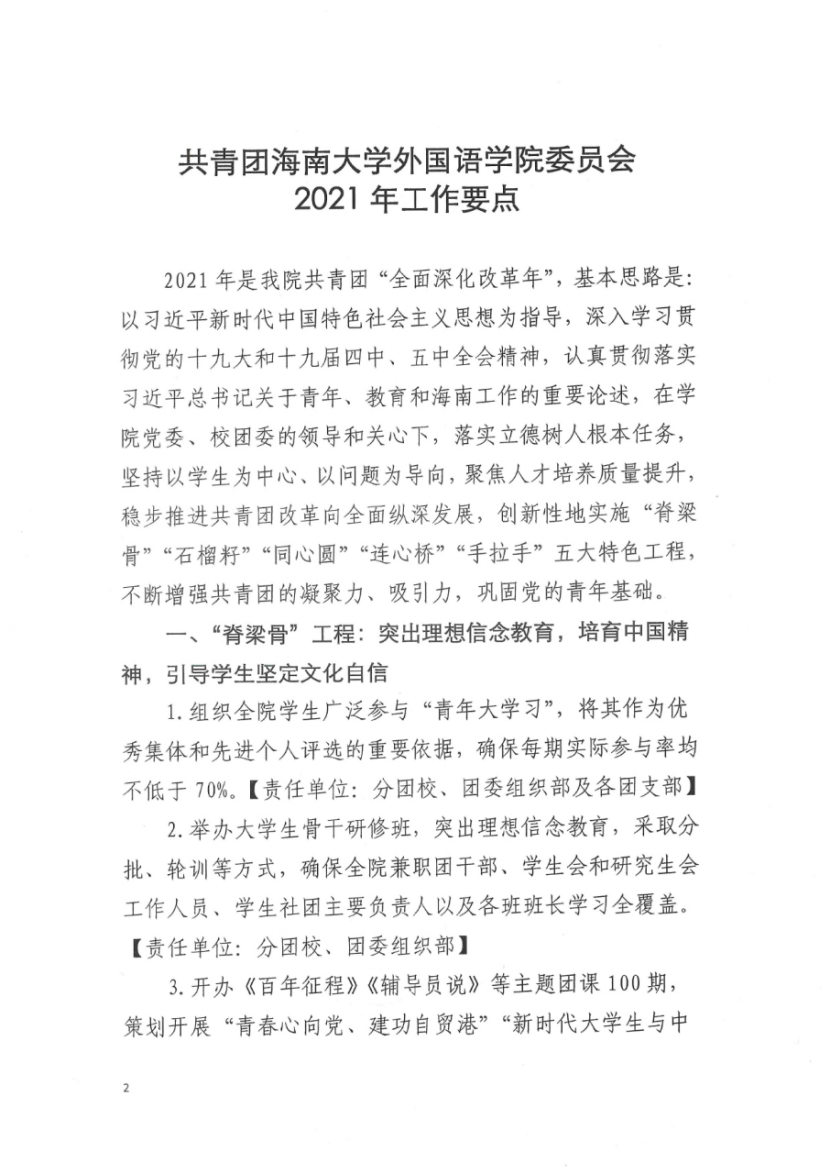 2021年是公司共青团“全面深化改革年”,基本思路是:以习近平新时代中国特色社会主义思想为指导,深入学习贯彻党的十九大和十九届四中、五中全会精神,认真贯彻落实习近平总书记关于青年、教育和海南工作的重要论述,在公司党委、校团委的领导和关心下,落实立德树人根本任务,坚持以员工为中心、以问题为导向,聚焦人才培养质量提升,稳步推进共青团改革向全面纵深发展,创新性地实施“脊梁骨”“石榴籽”“同心圆”“连心桥”“手拉手”五大特色工程,不断增强共青团的凝聚力、吸引力,巩固党的青年基础。