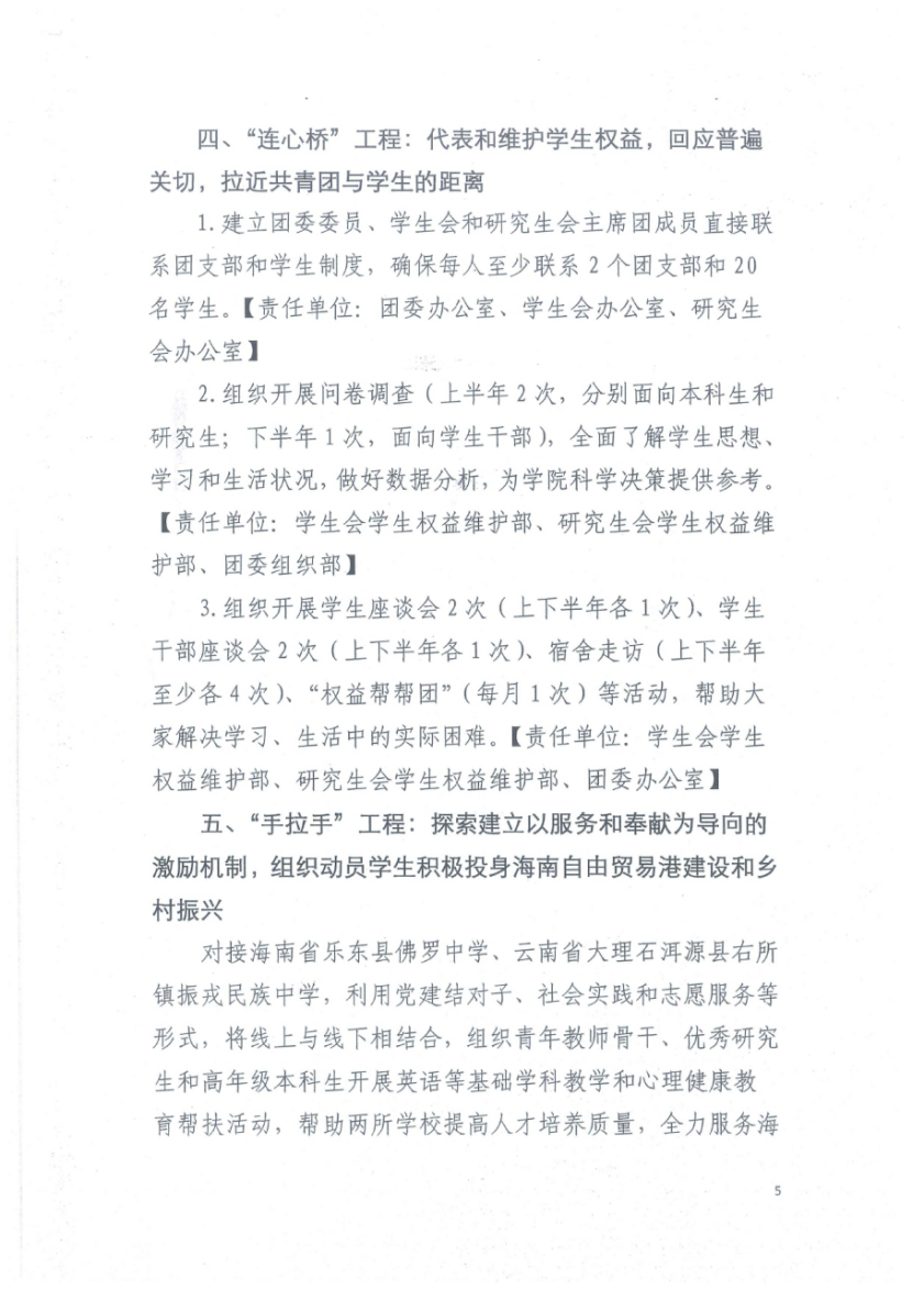 1.建立团委委员、员工会和研究生会主席团成员直接联系团支部和员工制度,确保每人至少联系2个团支部和20名员工。【责任单位:团委办公室、员工会办公室、研究生会办公室】