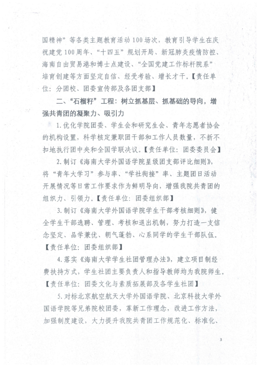 3.开办《百年征程》《辅导员说》等主题团课100期,策划开展“青春心向党、建功自贸港”“新时代老员工与中国精神”等各类主题教育活动100场次,教育引导员工在庆祝建党100周年、“十四五”规划开局、新冠肺炎疫情防控、海南自由贸易港和博士点建设、“全国党建工作标杆院系”培育创建等方面坚定自信、经受考验、增长才干。【责任单位:分团校、团委宣传部及各团支部】