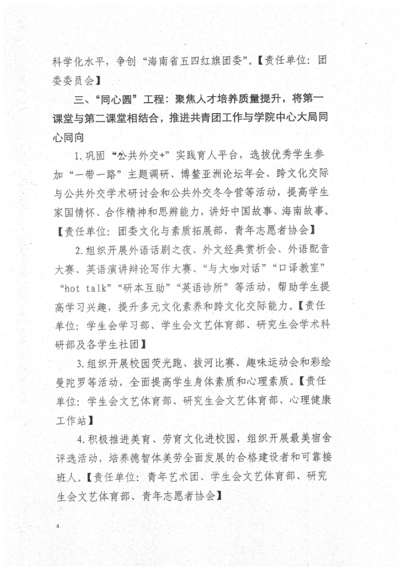 1.巩固“公共外交+”实践育人平台,选拔优秀员工参加“一带一路”主题调研、博鳌亚洲论坛年会、跨文化交际与公共外交学术研讨会和公共外交冬令营等活动,提高员工家国情怀、合作精神和思辨能力,讲好中国故事、海南故事。【责任单位:团委文化与素质拓展部、青年志愿者协会】