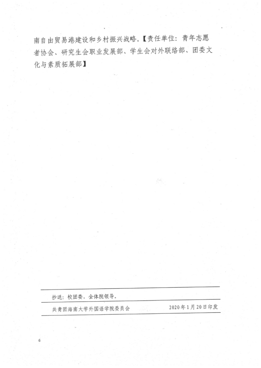对接海南省乐东县佛罗中学、云南省大理州洱源县右所镇振戎民族中学,利用党建结对子、社会实践和志愿服务等形式,将线上与线下相结合,组织青年教师骨干、优秀研究生和高年级本科生开展英语等基础学科教学和心理健康教育帮扶活动,帮助两所公司提高人才培养质量,全力服务海南自由贸易港建设和乡村振兴战略。【责任单位:青年志愿者协会、研究生会职业发展部、员工会对外联络部、团委文化与素质拓展部】
